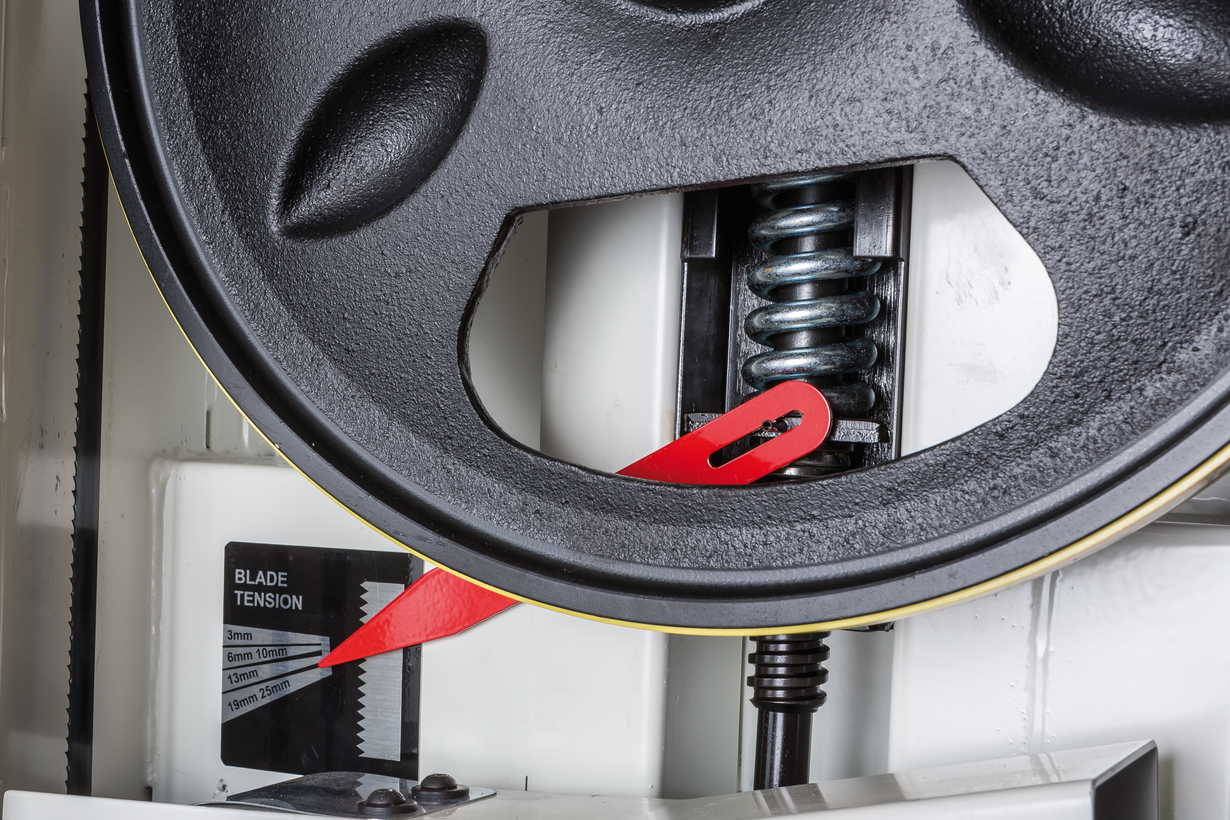 Механизм натяжения и центрирования ленты включает в себя две группы трехроликовых направляющих на шарикоподшипниках, стрелочный индикатор уровня натяжения, регулирующие маховики, два смотровых окошка и рычаг быстрого натяжения-ослабления. Он не совсем обычен, поскольку имеет не два, а три фиксированных положения: рабочее (плотно натянуто), для хранения (лента ослаблена, но держится на шкивах) и сервисное (для замены полотна). Чтобы улучшить плавность работы, использованы чугунные шкивы с массивным телом, а не в виде спицованных колес, как раньше.