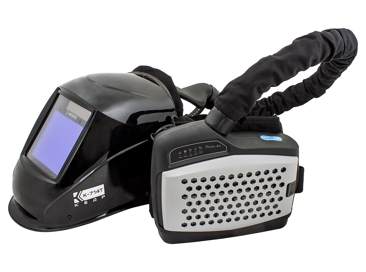 Маска сварщика КЕДР К-714Т с ТУРБОБЛОКОМ, черная- предназначена для защиты глаз от опасного и вредного излучения дуги и защиты органов дыхания от пыли, сварочных дымов, других аэрозолей.